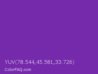 YUV 78.544,45.581,33.726 Color is a normal purple color and the nearest color is Grape #6f2da8. Hex code #7529ab and RGB value is rgb(117,41,171). In RGB color space, this color is composed of 46% red, 16% green, 67% blue, In CMYK color space, this color is composed of 32% cyan, 76% magenta, 0% yellow , 33% black , In HSL color space, this color has a hue angle of 275° , 61% saturation and 42% lightness.