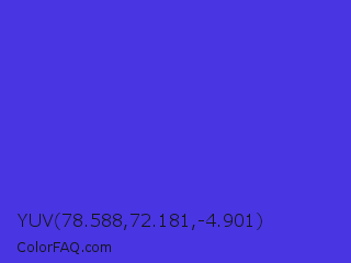 YUV 78.588,72.181,-4.901 Color is a normal indigo color and the nearest color is Palatinate Blue #273be2. Hex code #4935e1 and RGB value is rgb(73,53,225). In RGB color space, this color is composed of 29% red, 21% green, 88% blue, In CMYK color space, this color is composed of 68% cyan, 76% magenta, 0% yellow , 12% black , In HSL color space, this color has a hue angle of 247° , 74% saturation and 55% lightness.