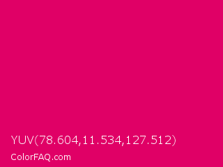 YUV 78.604,11.534,127.512 Color is a normal rose color and the nearest color is Raspberry #e30b5d. Hex code #e00066 and RGB value is rgb(224,-0,102). In RGB color space, this color is composed of 88% red, 0% green, 40% blue, In CMYK color space, this color is composed of 0% cyan, 100% magenta, 54% yellow , 12% black , In HSL color space, this color has a hue angle of 333° , 100% saturation and 44% lightness.