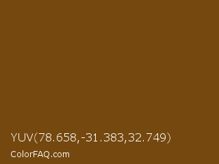 YUV 78.658,-31.383,32.749 Color is a dark orange color and the nearest color is Raw Umber #734a12. Hex code #74480f and RGB value is rgb(116,72,15). In RGB color space, this color is composed of 45% red, 28% green, 6% blue, In CMYK color space, this color is composed of 0% cyan, 38% magenta, 87% yellow , 55% black , In HSL color space, this color has a hue angle of 34° , 77% saturation and 26% lightness.