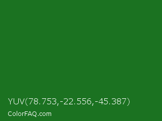 YUV 78.753,-22.556,-45.387 Color is a dark green color and the nearest color is La Salle Green #087830. Hex code #1b7221 and RGB value is rgb(27,114,33). In RGB color space, this color is composed of 11% red, 45% green, 13% blue, In CMYK color space, this color is composed of 76% cyan, 0% magenta, 71% yellow , 55% black , In HSL color space, this color has a hue angle of 124° , 62% saturation and 28% lightness.