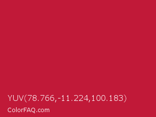 YUV 78.766,-11.224,100.183 Color is a normal red color and the nearest color is Cardinal #c41e3a. Hex code #c11938 and RGB value is rgb(193,25,56). In RGB color space, this color is composed of 76% red, 10% green, 22% blue, In CMYK color space, this color is composed of 0% cyan, 87% magenta, 71% yellow , 24% black , In HSL color space, this color has a hue angle of 349° , 77% saturation and 43% lightness.
