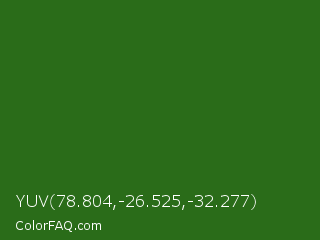 YUV 78.804,-26.525,-32.277 Color is a dark green color and the nearest color is Dell #396413. Hex code #2a6c19 and RGB value is rgb(42,108,25). In RGB color space, this color is composed of 16% red, 42% green, 10% blue, In CMYK color space, this color is composed of 61% cyan, 0% magenta, 77% yellow , 58% black , In HSL color space, this color has a hue angle of 108° , 62% saturation and 26% lightness.