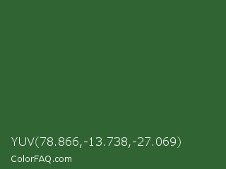 YUV 78.866,-13.738,-27.069 Color is a dark green color and the nearest color is Mughal Green #306030. Hex code #306433 and RGB value is rgb(48,100,51). In RGB color space, this color is composed of 19% red, 39% green, 20% blue, In CMYK color space, this color is composed of 52% cyan, 0% magenta, 49% yellow , 61% black , In HSL color space, this color has a hue angle of 123° , 35% saturation and 29% lightness.