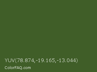 YUV 78.874,-19.165,-13.044 Color is a dark green color and the nearest color is Dark Moss Green #4a5d23. Hex code #405e28 and RGB value is rgb(64,94,40). In RGB color space, this color is composed of 25% red, 37% green, 16% blue, In CMYK color space, this color is composed of 32% cyan, 0% magenta, 57% yellow , 63% black , In HSL color space, this color has a hue angle of 93° , 40% saturation and 26% lightness.