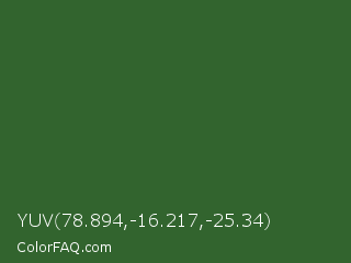 YUV 78.894,-16.217,-25.34 Color is a dark green color and the nearest color is Mughal Green #306030. Hex code #32642e and RGB value is rgb(50,100,46). In RGB color space, this color is composed of 20% red, 39% green, 18% blue, In CMYK color space, this color is composed of 50% cyan, 0% magenta, 54% yellow , 61% black , In HSL color space, this color has a hue angle of 116° , 37% saturation and 29% lightness.