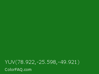 YUV 78.922,-25.598,-49.921 Color is a dark green color and the nearest color is Forest Green #228b22. Hex code #16761b and RGB value is rgb(22,118,27). In RGB color space, this color is composed of 9% red, 46% green, 11% blue, In CMYK color space, this color is composed of 81% cyan, 0% magenta, 77% yellow , 54% black , In HSL color space, this color has a hue angle of 123° , 69% saturation and 27% lightness.