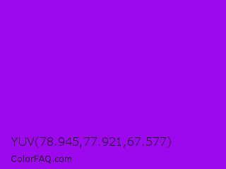 YUV 78.945,77.921,67.577 Color is a normal purple color and the nearest color is Vivid Violet #9f00ff. Hex code #9c09ed and RGB value is rgb(156,9,237). In RGB color space, this color is composed of 61% red, 4% green, 93% blue, In CMYK color space, this color is composed of 34% cyan, 96% magenta, 0% yellow , 7% black , In HSL color space, this color has a hue angle of 279° , 93% saturation and 48% lightness.