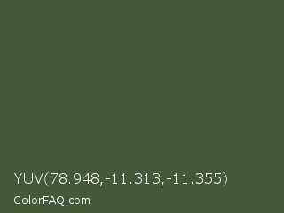YUV 78.948,-11.313,-11.355 Color is a dark green color and the nearest color is Tom Thumb #3f583b. Hex code #425a38 and RGB value is rgb(66,90,56). In RGB color space, this color is composed of 26% red, 35% green, 22% blue, In CMYK color space, this color is composed of 27% cyan, 0% magenta, 38% yellow , 65% black , In HSL color space, this color has a hue angle of 102° , 23% saturation and 29% lightness.