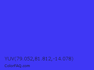YUV 79.052,81.812,-14.078 Color is a normal indigo color and the nearest color is Palatinate Blue #273be2. Hex code #3f37f5 and RGB value is rgb(63,55,245). In RGB color space, this color is composed of 25% red, 22% green, 96% blue, In CMYK color space, this color is composed of 74% cyan, 78% magenta, 0% yellow , 4% black , In HSL color space, this color has a hue angle of 243° , 90% saturation and 59% lightness.
