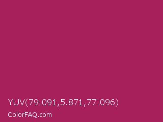 YUV 79.091,5.871,77.096 Color is a normal rose color and the nearest color is Amaranth Purple #ab274f. Hex code #a7205b and RGB value is rgb(167,32,91). In RGB color space, this color is composed of 65% red, 13% green, 36% blue, In CMYK color space, this color is composed of 0% cyan, 81% magenta, 46% yellow , 35% black , In HSL color space, this color has a hue angle of 334° , 68% saturation and 39% lightness.