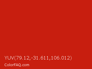 YUV 79.12,-31.611,106.012 Color is a normal red color and the nearest color is International Orange Engineering #ba160c. Hex code #c81e0f and RGB value is rgb(200,30,15). In RGB color space, this color is composed of 78% red, 12% green, 6% blue, In CMYK color space, this color is composed of 0% cyan, 85% magenta, 93% yellow , 22% black , In HSL color space, this color has a hue angle of 5° , 86% saturation and 42% lightness.