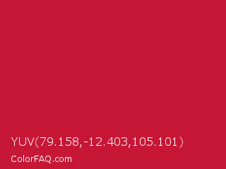 YUV 79.158,-12.403,105.101 Color is a normal red color and the nearest color is Cardinal #c41e3a. Hex code #c71736 and RGB value is rgb(199,23,54). In RGB color space, this color is composed of 78% red, 9% green, 21% blue, In CMYK color space, this color is composed of 0% cyan, 88% magenta, 73% yellow , 22% black , In HSL color space, this color has a hue angle of 349° , 79% saturation and 44% lightness.