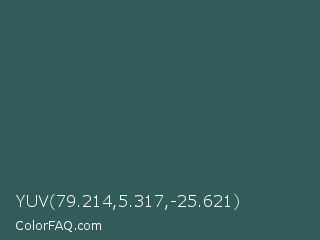 YUV 79.214,5.317,-25.621 Color is a dark cyan color and the nearest color is Spectra #2f5a57. Hex code #325c5a and RGB value is rgb(50,92,90). In RGB color space, this color is composed of 20% red, 36% green, 35% blue, In CMYK color space, this color is composed of 46% cyan, 0% magenta, 2% yellow , 64% black , In HSL color space, this color has a hue angle of 177° , 30% saturation and 28% lightness.