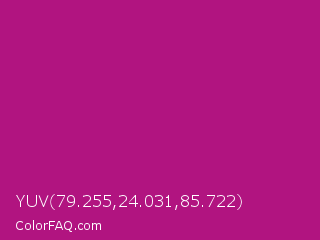 YUV 79.255,24.031,85.722 Color is a normal magenta color and the nearest color is Red Violet #c71585. Hex code #b11480 and RGB value is rgb(177,20,128). In RGB color space, this color is composed of 69% red, 8% green, 50% blue, In CMYK color space, this color is composed of 0% cyan, 89% magenta, 28% yellow , 31% black , In HSL color space, this color has a hue angle of 319° , 80% saturation and 39% lightness.