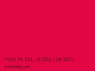 YUV 79.261,-5.059,129.567 Color is a normal rose color and the nearest color is Red Ribbon #ed0a3f. Hex code #e30645 and RGB value is rgb(227,6,69). In RGB color space, this color is composed of 89% red, 2% green, 27% blue, In CMYK color space, this color is composed of 0% cyan, 97% magenta, 70% yellow , 11% black , In HSL color space, this color has a hue angle of 343° , 95% saturation and 46% lightness.