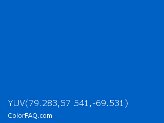 YUV 79.283,57.541,-69.531 Color is a normal blue color and the nearest color is Science Blue #0066cc. Hex code #0061c4 and RGB value is rgb(0,97,196). In RGB color space, this color is composed of 0% red, 38% green, 77% blue, In CMYK color space, this color is composed of 100% cyan, 51% magenta, 0% yellow , 23% black , In HSL color space, this color has a hue angle of 210° , 100% saturation and 38% lightness.