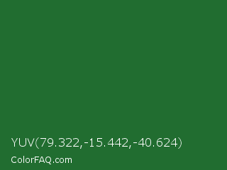 YUV 79.322,-15.442,-40.624 Color is a dark green color and the nearest color is Mughal Green #306030. Hex code #216d30 and RGB value is rgb(33,109,48). In RGB color space, this color is composed of 13% red, 43% green, 19% blue, In CMYK color space, this color is composed of 70% cyan, 0% magenta, 56% yellow , 57% black , In HSL color space, this color has a hue angle of 132° , 54% saturation and 28% lightness.