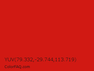 YUV 79.332,-29.744,113.719 Color is a normal red color and the nearest color is Lava #cf1020. Hex code #d11913 and RGB value is rgb(209,25,19). In RGB color space, this color is composed of 82% red, 10% green, 7% blue, In CMYK color space, this color is composed of 0% cyan, 88% magenta, 91% yellow , 18% black , In HSL color space, this color has a hue angle of 2° , 83% saturation and 45% lightness.