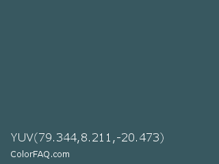YUV 79.344,8.211,-20.473 Color is a dark cyan color and the nearest color is Spectra #2f5a57. Hex code #385860 and RGB value is rgb(56,88,96). In RGB color space, this color is composed of 22% red, 35% green, 38% blue, In CMYK color space, this color is composed of 42% cyan, 8% magenta, 0% yellow , 62% black , In HSL color space, this color has a hue angle of 192° , 26% saturation and 30% lightness.