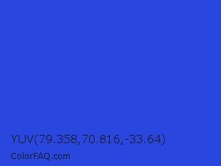 YUV 79.358,70.816,-33.64 Color is a normal blue color and the nearest color is Palatinate Blue #273be2. Hex code #2947df and RGB value is rgb(41,71,223). In RGB color space, this color is composed of 16% red, 28% green, 87% blue, In CMYK color space, this color is composed of 82% cyan, 68% magenta, 0% yellow , 13% black , In HSL color space, this color has a hue angle of 230° , 74% saturation and 52% lightness.
