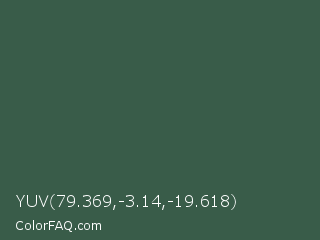 YUV 79.369,-3.14,-19.618 Color is a dark green color and the nearest color is Stromboli #325d52. Hex code #395c49 and RGB value is rgb(57,92,73). In RGB color space, this color is composed of 22% red, 36% green, 29% blue, In CMYK color space, this color is composed of 38% cyan, 0% magenta, 21% yellow , 64% black , In HSL color space, this color has a hue angle of 147° , 23% saturation and 29% lightness.