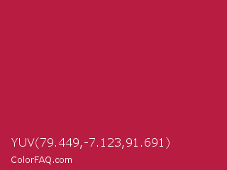 YUV 79.449,-7.123,91.691 Color is a normal red color and the nearest color is French Wine #ac1e44. Hex code #b81d41 and RGB value is rgb(184,29,65). In RGB color space, this color is composed of 72% red, 11% green, 25% blue, In CMYK color space, this color is composed of 0% cyan, 84% magenta, 65% yellow , 28% black , In HSL color space, this color has a hue angle of 346° , 73% saturation and 42% lightness.