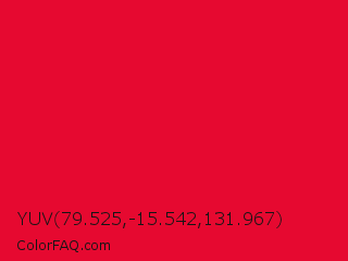 YUV 79.525,-15.542,131.967 Color is a normal red color and the nearest color is Medium Candy Apple Red #e2062c. Hex code #e60930 and RGB value is rgb(230,9,48). In RGB color space, this color is composed of 90% red, 4% green, 19% blue, In CMYK color space, this color is composed of 0% cyan, 96% magenta, 79% yellow , 10% black , In HSL color space, this color has a hue angle of 349° , 92% saturation and 47% lightness.