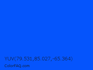 YUV 79.531,85.027,-65.364 Color is a normal blue color and the nearest color is Blue RYB #0247fe. Hex code #0554fc and RGB value is rgb(5,84,252). In RGB color space, this color is composed of 2% red, 33% green, 99% blue, In CMYK color space, this color is composed of 98% cyan, 67% magenta, 0% yellow , 1% black , In HSL color space, this color has a hue angle of 221° , 98% saturation and 50% lightness.