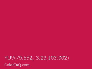 YUV 79.552,-3.23,103.002 Color is a normal rose color and the nearest color is Pictorial Carmine #c30b4e. Hex code #c51549 and RGB value is rgb(197,21,73). In RGB color space, this color is composed of 77% red, 8% green, 29% blue, In CMYK color space, this color is composed of 0% cyan, 89% magenta, 63% yellow , 23% black , In HSL color space, this color has a hue angle of 342° , 81% saturation and 43% lightness.