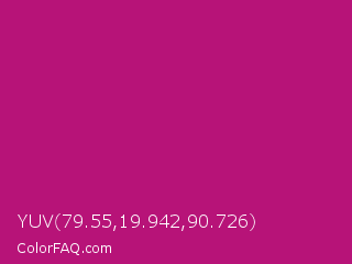 YUV 79.55,19.942,90.726 Color is a normal magenta color and the nearest color is Red Violet #c71585. Hex code #b71378 and RGB value is rgb(183,19,120). In RGB color space, this color is composed of 72% red, 7% green, 47% blue, In CMYK color space, this color is composed of 0% cyan, 90% magenta, 34% yellow , 28% black , In HSL color space, this color has a hue angle of 323° , 81% saturation and 40% lightness.