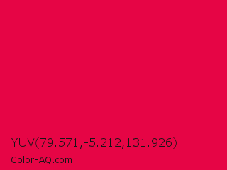 YUV 79.571,-5.212,131.926 Color is a normal rose color and the nearest color is Red Ribbon #ed0a3f. Hex code #e60545 and RGB value is rgb(230,5,69). In RGB color space, this color is composed of 90% red, 2% green, 27% blue, In CMYK color space, this color is composed of 0% cyan, 98% magenta, 70% yellow , 10% black , In HSL color space, this color has a hue angle of 343° , 96% saturation and 46% lightness.