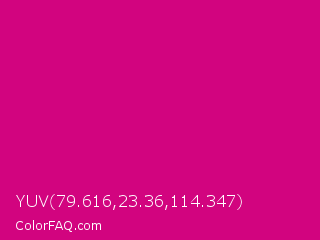 YUV 79.616,23.36,114.347 Color is a normal magenta color and the nearest color is Mexican Pink #e4007c. Hex code #d2047f and RGB value is rgb(210,4,127). In RGB color space, this color is composed of 82% red, 2% green, 50% blue, In CMYK color space, this color is composed of 0% cyan, 98% magenta, 40% yellow , 18% black , In HSL color space, this color has a hue angle of 324° , 96% saturation and 42% lightness.