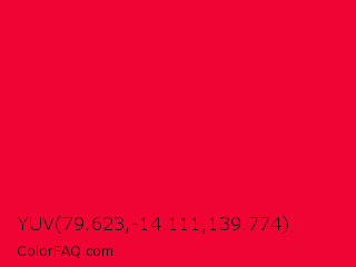 YUV 79.623,-14.111,139.774 Color is a normal red color and the nearest color is Red Munsell #f2003c. Hex code #ef0433 and RGB value is rgb(239,4,51). In RGB color space, this color is composed of 94% red, 2% green, 20% blue, In CMYK color space, this color is composed of 0% cyan, 98% magenta, 79% yellow , 6% black , In HSL color space, this color has a hue angle of 348° , 97% saturation and 48% lightness.