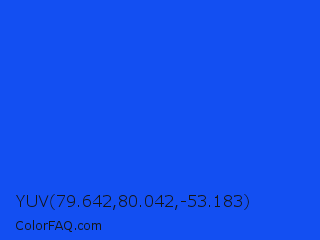YUV 79.642,80.042,-53.183 Color is a normal blue color and the nearest color is Blue RYB #0247fe. Hex code #134ff2 and RGB value is rgb(19,79,242). In RGB color space, this color is composed of 7% red, 31% green, 95% blue, In CMYK color space, this color is composed of 92% cyan, 67% magenta, 0% yellow , 5% black , In HSL color space, this color has a hue angle of 224° , 90% saturation and 51% lightness.