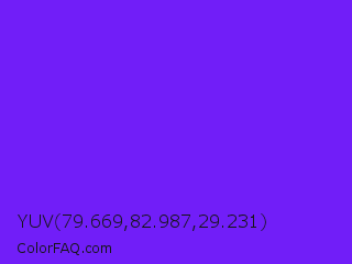 YUV 79.669,82.987,29.231 Color is a normal violet color and the nearest color is Electric Indigo #6f00ff. Hex code #711ef8 and RGB value is rgb(113,30,248). In RGB color space, this color is composed of 44% red, 12% green, 97% blue, In CMYK color space, this color is composed of 54% cyan, 88% magenta, 0% yellow , 3% black , In HSL color space, this color has a hue angle of 263° , 94% saturation and 55% lightness.