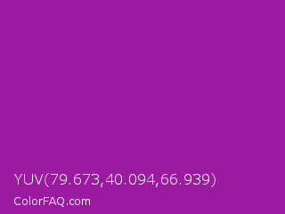 YUV 79.673,40.094,66.939 Color is a normal magenta color and the nearest color is Violet Eggplant #991199. Hex code #9c19a1 and RGB value is rgb(156,25,161). In RGB color space, this color is composed of 61% red, 10% green, 63% blue, In CMYK color space, this color is composed of 3% cyan, 84% magenta, 0% yellow , 37% black , In HSL color space, this color has a hue angle of 298° , 73% saturation and 36% lightness.