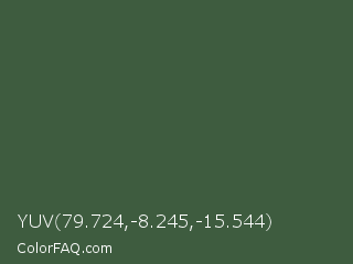 YUV 79.724,-8.245,-15.544 Color is a dark green color and the nearest color is Tom Thumb #3f583b. Hex code #3e5c3f and RGB value is rgb(62,92,63). In RGB color space, this color is composed of 24% red, 36% green, 25% blue, In CMYK color space, this color is composed of 33% cyan, 0% magenta, 32% yellow , 64% black , In HSL color space, this color has a hue angle of 122° , 19% saturation and 30% lightness.