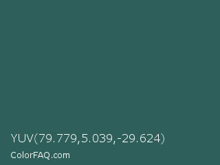 YUV 79.779,5.039,-29.624 Color is a dark cyan color and the nearest color is Spectra #2f5a57. Hex code #2e5f5a and RGB value is rgb(46,95,90). In RGB color space, this color is composed of 18% red, 37% green, 35% blue, In CMYK color space, this color is composed of 52% cyan, 0% magenta, 5% yellow , 63% black , In HSL color space, this color has a hue angle of 174° , 35% saturation and 28% lightness.