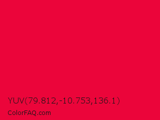 YUV 79.812,-10.753,136.1 Color is a normal red color and the nearest color is Red Ribbon #ed0a3f. Hex code #eb053a and RGB value is rgb(235,5,58). In RGB color space, this color is composed of 92% red, 2% green, 23% blue, In CMYK color space, this color is composed of 0% cyan, 98% magenta, 75% yellow , 8% black , In HSL color space, this color has a hue angle of 346° , 96% saturation and 47% lightness.