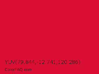 YUV 79.844,-12.741,120.286 Color is a normal red color and the nearest color is Crimson #dc143c. Hex code #d90f36 and RGB value is rgb(217,15,54). In RGB color space, this color is composed of 85% red, 6% green, 21% blue, In CMYK color space, this color is composed of 0% cyan, 93% magenta, 75% yellow , 15% black , In HSL color space, this color has a hue angle of 348° , 87% saturation and 45% lightness.
