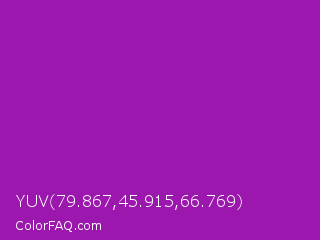 YUV 79.867,45.915,66.769 Color is a normal magenta color and the nearest color is Violet Eggplant #991199. Hex code #9c17ad and RGB value is rgb(156,23,173). In RGB color space, this color is composed of 61% red, 9% green, 68% blue, In CMYK color space, this color is composed of 10% cyan, 87% magenta, 0% yellow , 32% black , In HSL color space, this color has a hue angle of 293° , 77% saturation and 38% lightness.