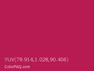 YUV 79.914,1.028,90.406 Color is a normal rose color and the nearest color is Rose Red #c21e56. Hex code #b71b52 and RGB value is rgb(183,27,82). In RGB color space, this color is composed of 72% red, 11% green, 32% blue, In CMYK color space, this color is composed of 0% cyan, 85% magenta, 55% yellow , 28% black , In HSL color space, this color has a hue angle of 339° , 74% saturation and 41% lightness.