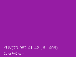 YUV 79.982,41.421,61.406 Color is a normal magenta color and the nearest color is Violet Eggplant #991199. Hex code #961ca4 and RGB value is rgb(150,28,164). In RGB color space, this color is composed of 59% red, 11% green, 64% blue, In CMYK color space, this color is composed of 9% cyan, 83% magenta, 0% yellow , 36% black , In HSL color space, this color has a hue angle of 294° , 71% saturation and 38% lightness.