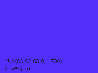 YUV 80.02,83.8,1.736 Color is a normal indigo color and the nearest color is Han Purple #5218fa. Hex code #522efa and RGB value is rgb(82,46,250). In RGB color space, this color is composed of 32% red, 18% green, 98% blue, In CMYK color space, this color is composed of 67% cyan, 82% magenta, 0% yellow , 2% black , In HSL color space, this color has a hue angle of 251° , 95% saturation and 58% lightness.