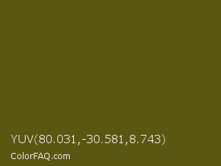 YUV 80.031,-30.581,8.743 Color is a very dark yellow color and the nearest color is Saratoga #555b10. Hex code #5a5712 and RGB value is rgb(90,87,18). In RGB color space, this color is composed of 35% red, 34% green, 7% blue, In CMYK color space, this color is composed of 0% cyan, 3% magenta, 80% yellow , 65% black , In HSL color space, this color has a hue angle of 58° , 67% saturation and 21% lightness.