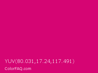 YUV 80.031,17.24,117.491 Color is a normal rose color and the nearest color is Red Purple #e40078. Hex code #d60573 and RGB value is rgb(214,5,115). In RGB color space, this color is composed of 84% red, 2% green, 45% blue, In CMYK color space, this color is composed of 0% cyan, 98% magenta, 46% yellow , 16% black , In HSL color space, this color has a hue angle of 328° , 95% saturation and 43% lightness.