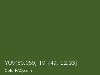 YUV 80.059,-19.749,-12.33 Color is a dark green color and the nearest color is Dark Moss Green #4a5d23. Hex code #425f28 and RGB value is rgb(66,95,40). In RGB color space, this color is composed of 26% red, 37% green, 16% blue, In CMYK color space, this color is composed of 31% cyan, 0% magenta, 58% yellow , 63% black , In HSL color space, this color has a hue angle of 92° , 41% saturation and 26% lightness.