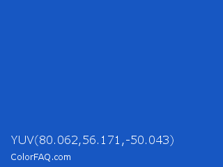 YUV 80.062,56.171,-50.043 Color is a normal blue color and the nearest color is Denim #1560bd. Hex code #1757c2 and RGB value is rgb(23,87,194). In RGB color space, this color is composed of 9% red, 34% green, 76% blue, In CMYK color space, this color is composed of 88% cyan, 55% magenta, 0% yellow , 24% black , In HSL color space, this color has a hue angle of 218° , 79% saturation and 43% lightness.