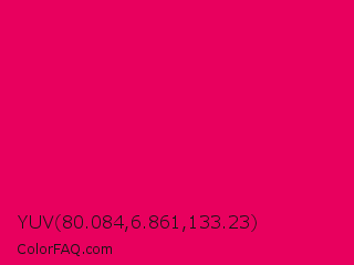 YUV 80.084,6.861,133.23 Color is a normal rose color and the nearest color is Raspberry #e30b5d. Hex code #e8005e and RGB value is rgb(232,-0,94). In RGB color space, this color is composed of 91% red, 0% green, 37% blue, In CMYK color space, this color is composed of 0% cyan, 100% magenta, 59% yellow , 9% black , In HSL color space, this color has a hue angle of 336° , 100% saturation and 45% lightness.